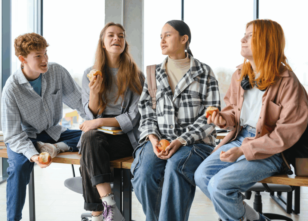 - Students eat breakfast during a break in the morning, often after first period or midway between breakfast and lunch.